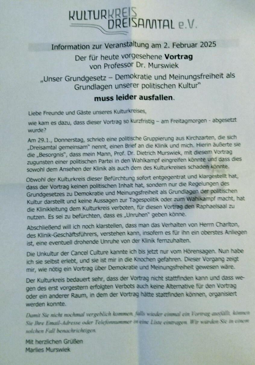 Was war passiert? Der Verein "Dreisamtal gemeinsam" schrieb an den Veranstalter und den Vortragenden im Tenor, dass man mit diesem Vortrag durch den Prof. Dr. Murswiek "zugunsten einer politischen Partei" (hier die AfD) Einflussnahme ausüben könnte. Und: die Klinik befürchtete "Unruhen". Das sorgte dann für eine Absage durch die Klinikleitung der Friedrich-Husemann-Klinik. An diesem Beispiel sieht man, wie skrupellos demokratiefeindliche Kräfte im Dreisamtal "die Strippen ziehen" und direkte Einschüchterung betreiben, wenn es darum geht, politische Unbeliebten zu zensieren und kalt zu stellen. Prof. Dr. Murswiek fiel dem Verein durch seine Verbindung und Unterstützung der AfD in der Vergangenheit auf. Er bezeichnete die Migrationspolitik der Bundesregierung als “einwanderungspolitisch gewollte oder in Kauf genommene Umformung des Volkes". "Dreisamtal gemeinsam" lebt einen lupenreinen Faschismus und betreibt die Ausgrenzung unliebsamer Gegner. Es zeigt sich aber auch, wie rückgratlos die lokale Zivilgesellschaft im Dreisamtal mittlerweile geworden ist und sich diesen Rattenfängern nicht in den Weg stellt. Im ganzen Land ereifern sich diese selbsternannten Hüter der Demokratie und gaukeln vor, sie seien die Guten. Sind sie nicht. Sie sind die Krebsgeschwüre der deutschen Gesellschaft.