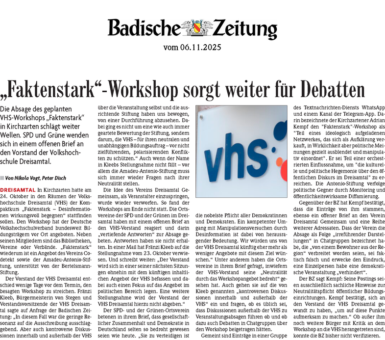Es hätte doch alles "ungestört" ablaufen sollen: die VHS Dreisamtal hatte hatte unter der Rubrik Bildung. Fr., 24.10.2025. "faktenstark – Desinformationen wirkungsvoll begegnen" von 16:00-19:15 Uhr eine Veranstaltung geplant, hinter u.a. die links/radikale Amadeu Antonio Stiftung steht. Der Vorstand der VHS Dreisamtal sagte dank Eingaben eines kritischen und aufmerksamen Bürgers diese Veranstaltung kurzfristig ab. Natürlich wollte der Verein "Dreisamtal Gemeinsam" diese Veranstaltung retten, was aber nicht gelang. Es zeigt sich, dass Kritik auch etwas bewirken kann. Doch es wurde nur ein Scharmützel verloren. Die bekannte Politbande im Dreisamtal überfällt die Bürger weiterhin mit ihren ideologischen Überfällen. Aber auch selbsternannte Propagandisten wie der Mitveranstalter Daniel Weimert von Codetekt kritisiert die Absage. Kein Wunder, dass sich diesen Herrschaften nicht erschließt, dass politische Bildung an einer VHS (noch) nicht nach Muster der nationalsozialistischen Gleichschaltung läuft.