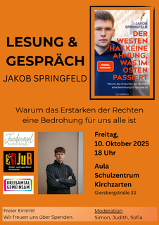 Der allseits bekannte Verein "Dreisamtal Gemeinsam" setzt seine Propaganda gegen Kritische im lokalen Umfeld fort. Und natürlich bietet das Schulzentrum Kirchzarten den passenden Raum für Hass und Hetze. In der Coronazeit war auch dieses Schulzentrum und sein Lehrkörper im Dreisamtal fest in die kranke Dramaturgie der Coronalüge eingebunden und "verrichteten ihre Arbeit" mit großem Eifer: das Tragen und Kontrollieren der sinnlosen Sklavenmaske und die beständige Diktion der Spritze zählten "zur Erziehung" der Jugendlichen. Jakob Springfeld zählt zum "Neumensch", einem Typ, dessen Elternhaus offensichtlich gut daran mitgewirkt hat, dass ihr Nachwuchs in fanatischer Weise gegen das eigene Land und seinen Werten kämpft Und nein: er ist kein Bestsellertyp, sondern einer der auffälligen Demokratiegegner aus dem Osten. Sein Kampf gegen die Bürgerlichkeit, gegen das Rechtsempfinden führt ihn zu solchen Lesungen protegiert durch das Land. Dass sich der Kirchzartener Politverein dieses politische Ungeziefer in die Gemeinde einlädt, zeigt, wessen Geist hier am Werk ist und zielgerichtet seine Zuhörer und Befürworter finden soll. Das Wirkungsvollste, diese Veranstaltung inhaltlich "zu sprengen", verhindert sich sicher an der heute fehlenden konservativen und nötigen Lautstärke der Gegenwehr im Dreisamtal.