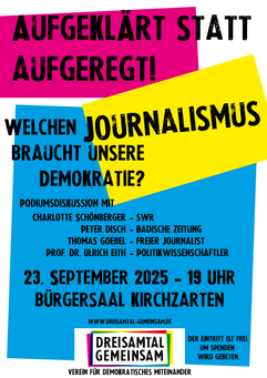 Auch hier zettelt der bekannte Verein ein Diskussion mit Unterstützung des Kirchzartener Rathauses an, deren Teilnehmer man getrost als journalistischen Müll bezeichnen könnte. Die richtige Frage hätte z.B. gestellt werden können: "Braucht es überhaupt noch einen solchen Journalismus?". Welche Medien sind denn überhaupt heute noch gefahrlos konsumierbar? Natürlich gehöret auf eine solche Bühne fachkundige Teilnehmer wie ein Paul Brandenburg und Andere der kritischen und alternativen Journalistenszene, die diesem Beruf heute alle Ehre machen. Ohne üppige staatliche Unterstützung und mit vollem persönlichem Risiko. So ist eine solche Bühne aber nur um eine Illusion zu einem mittlerweile verkommenen Berufstand, deren Überleben einzig in der alternativen Nachrichtenszene eine wahre Heimat findet.