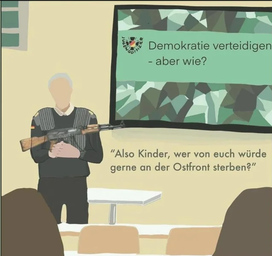 1933 - 1945: Lehrer mit einem ausgeprägten Parteibuch denunzierten die ihnen unangenehmen Schüler und sorgten sogar dafür, dass diese bevorzugt in den Kriegseinsatz geschickt wurden. Die heutigen Nachkommen dieser "Pädagogen" gleichen den damaligen Fanatikern im Geist und sind damit Teil des Bösen, der sich überall im Land manifestiert. Das Personal dieser Schule orientiert sich am üblen Denunziantentum der braunen Uniformen und ganz bestimmt ist dieser Schüler für die geistige Zukunft im Kampf gegen das wirklich Böse gut gerüstet. Interessant ist dabei m.E., dass man im Vorfeld über die Einstellung der Jugendlichen zu einem solchen Werbefeldzug in den Tod sich kundig machte. Respekt an diesen Schüler! Will man damit (wie damals) die Unangenehmen markieren, damit man diese dann schneller an die Front befördern wird? Das Ukrainische Todesregime jedenfalls arbeitet aktuell nach solchen "Standards" und die deutsche Regierung und ihre Anhänger unterstützen dies. Eine Blaupause für das Kommende auch auf deutschem Boden? Dieser Staat ist längst keiner Verteidigung mehr würdig.